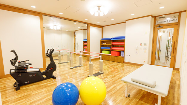 理学療法士(PT)などによる機能回復・維持訓練を館内の専用リハビリ室でご利用いただけます。